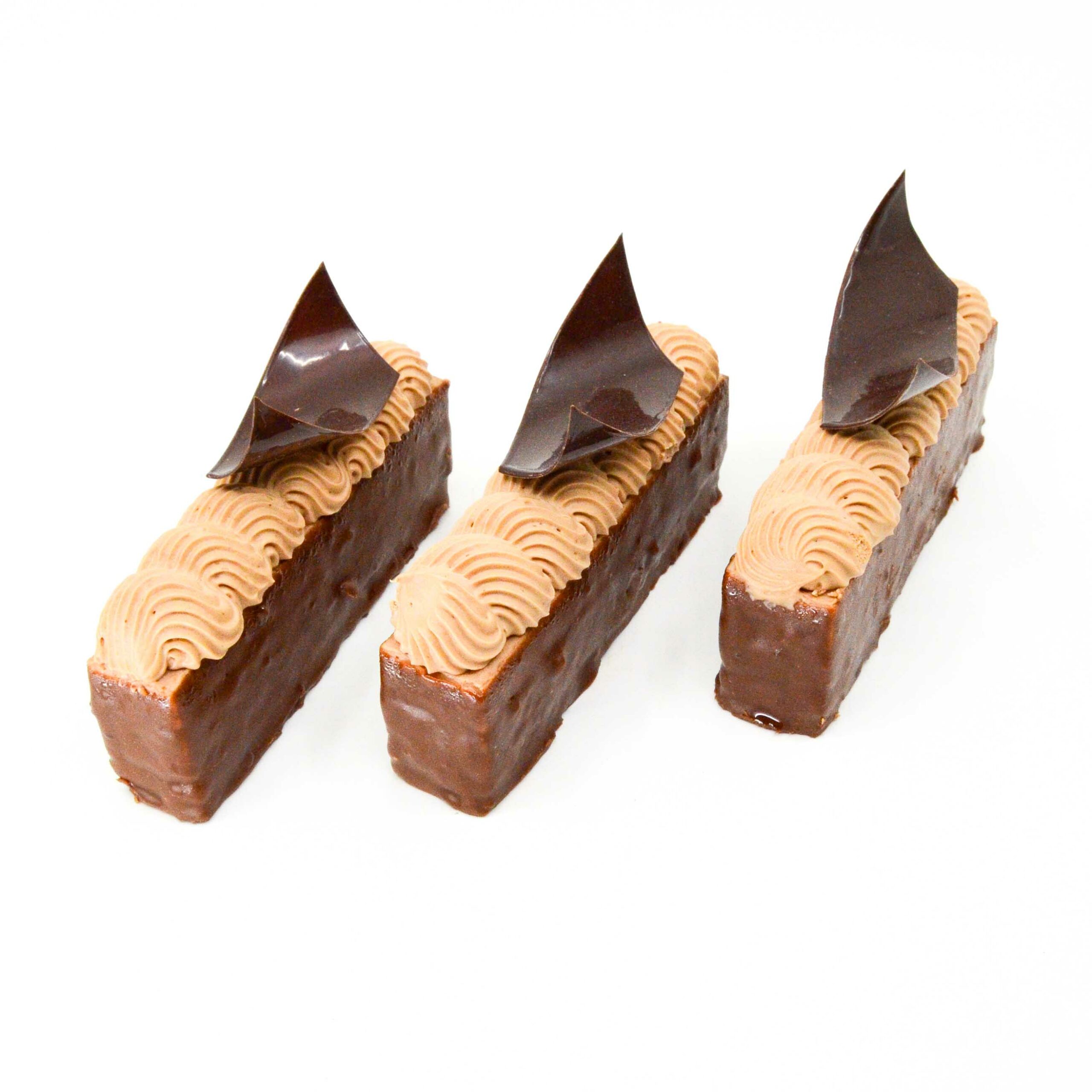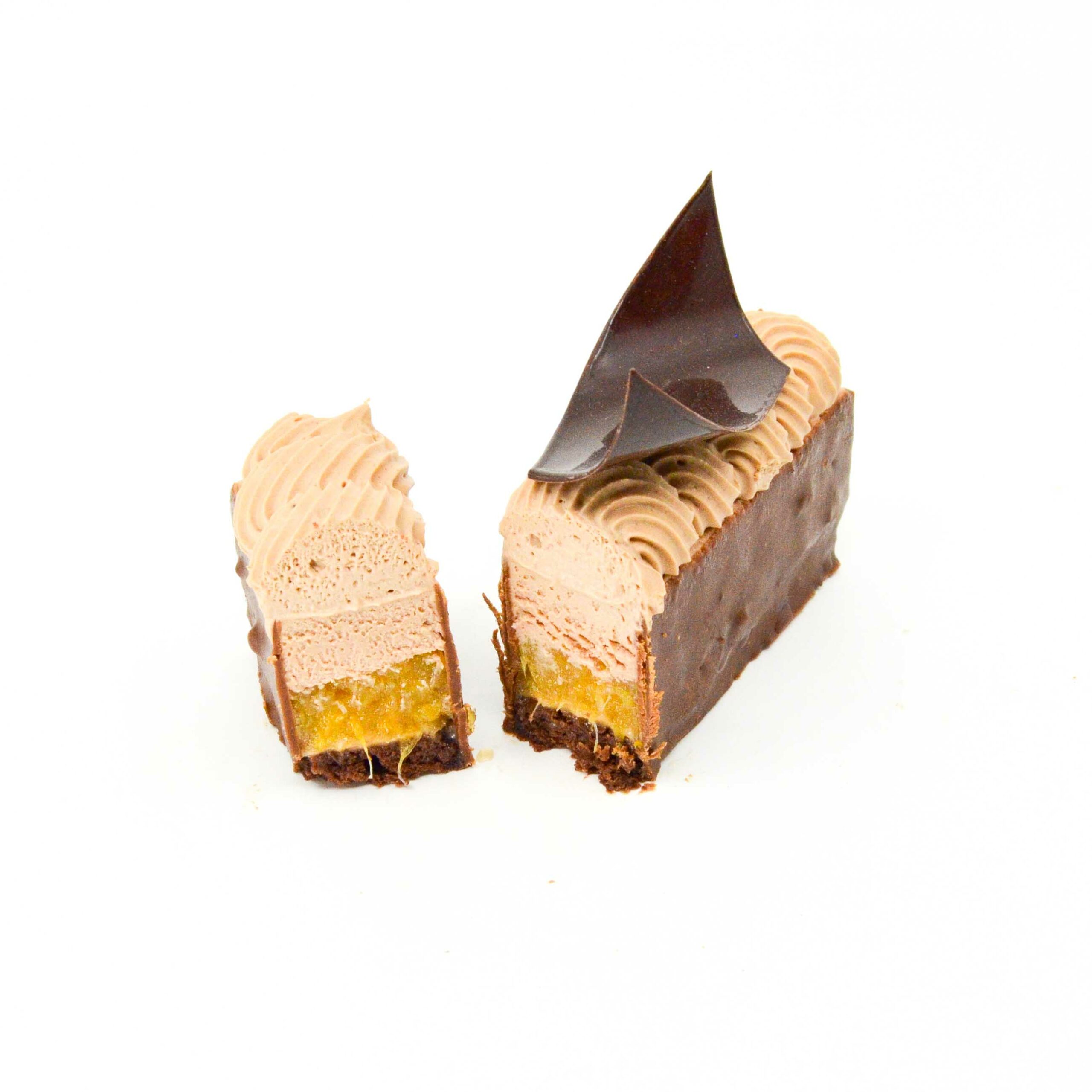 Un entremet de caractère alliant la fraîcheur des agrumes (orange, mandarine) avec la douceur du chocolat au lait… pour un dessert léger! Il se compose d’un biscuit cacao, de caramel et éclat de nougatine, suivi d’un confit orange/mandarine, une mousse chocolat lait et d’une ganache montée chocolat lait.