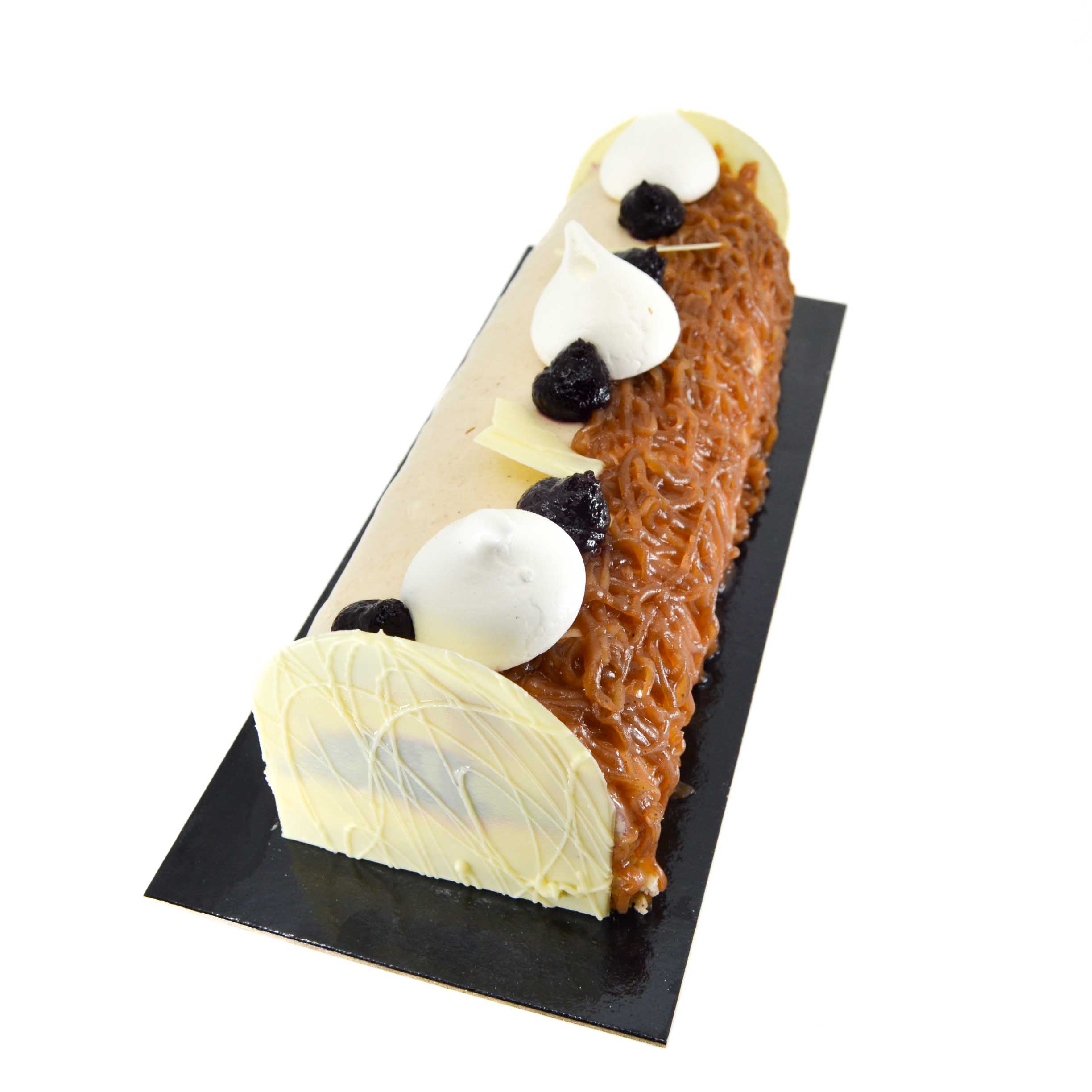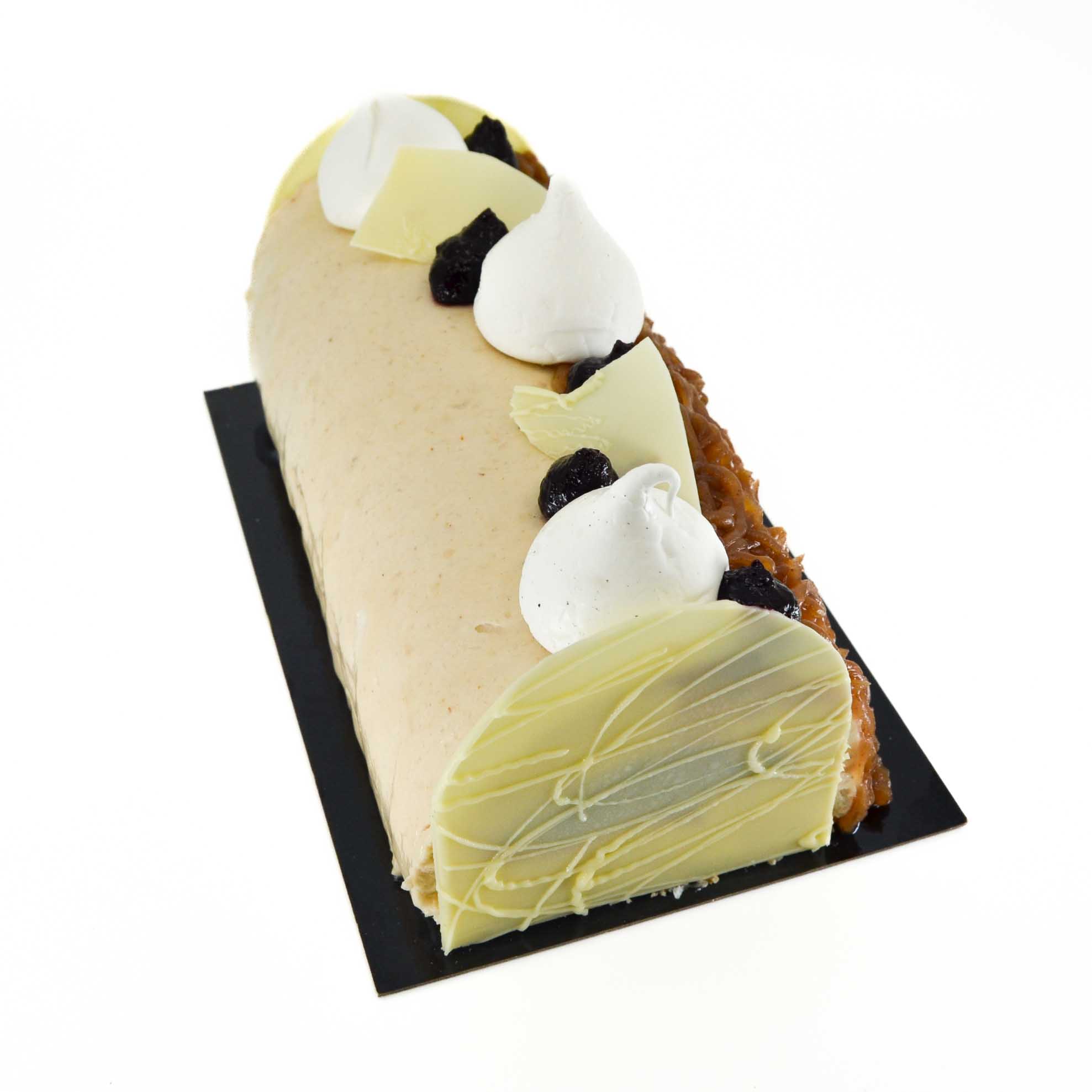 Biscuit Cuillère châtaigne, Chocolat Blanc 34%, Compotée Cassis, Crème de Marron, Meringue, Mousse Marron, Nappage Neutre