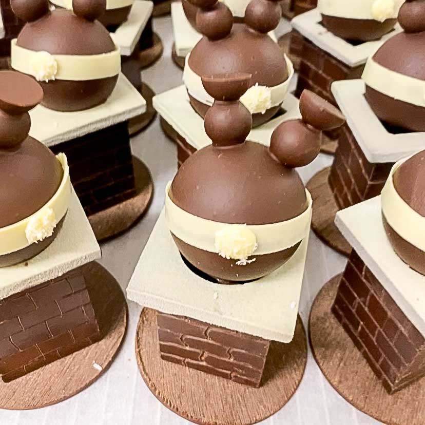 Découvrez notre création des fêtes; Père Noël plonge dans la cheminée garnie de tant de gourmandises chocolatées. Disponible en chocolat lait ou noir. Cette création est sans colorant. Une jolie pièce sculptée qui pourra embellir votre table et ravir les papilles de toute la famille. Environs 170g.