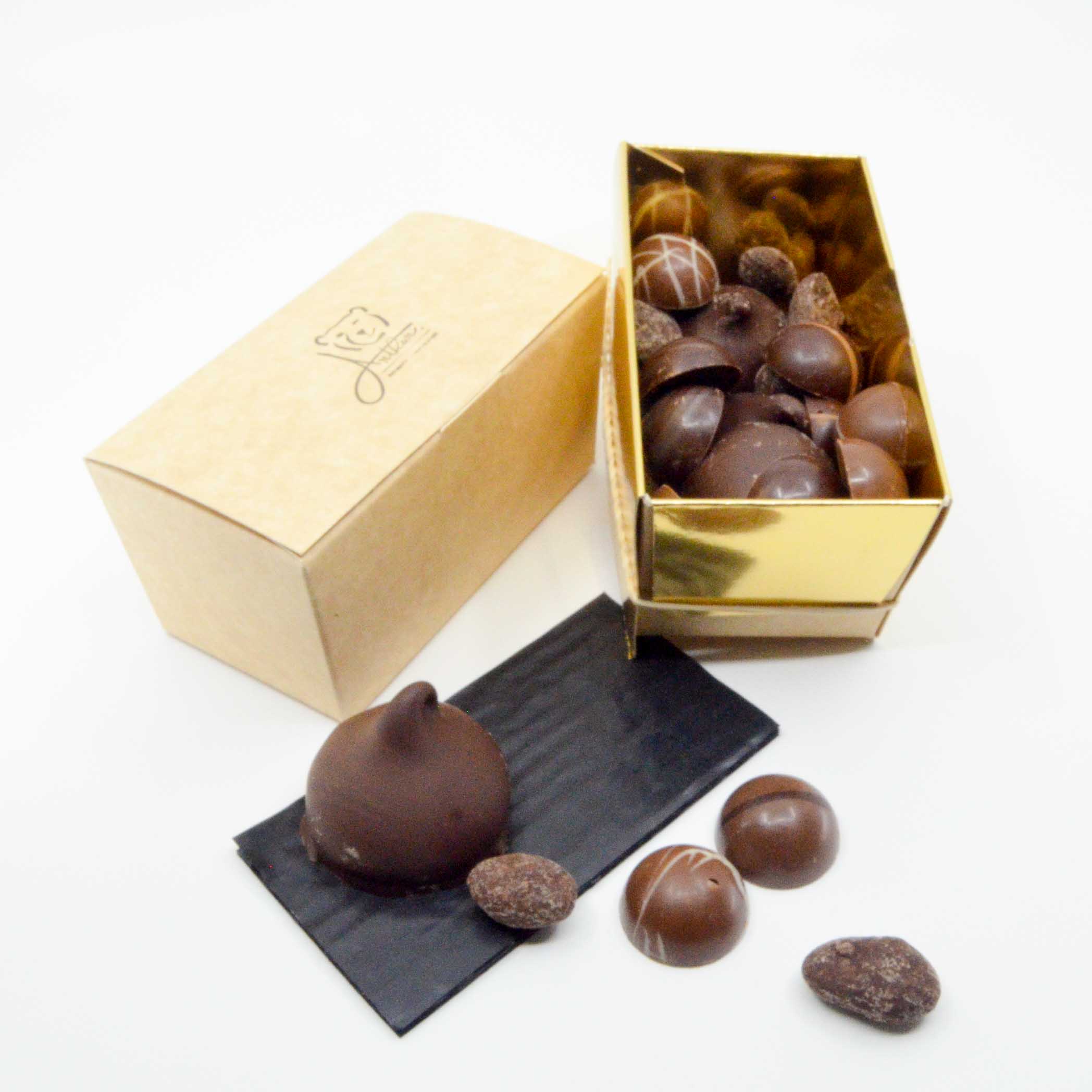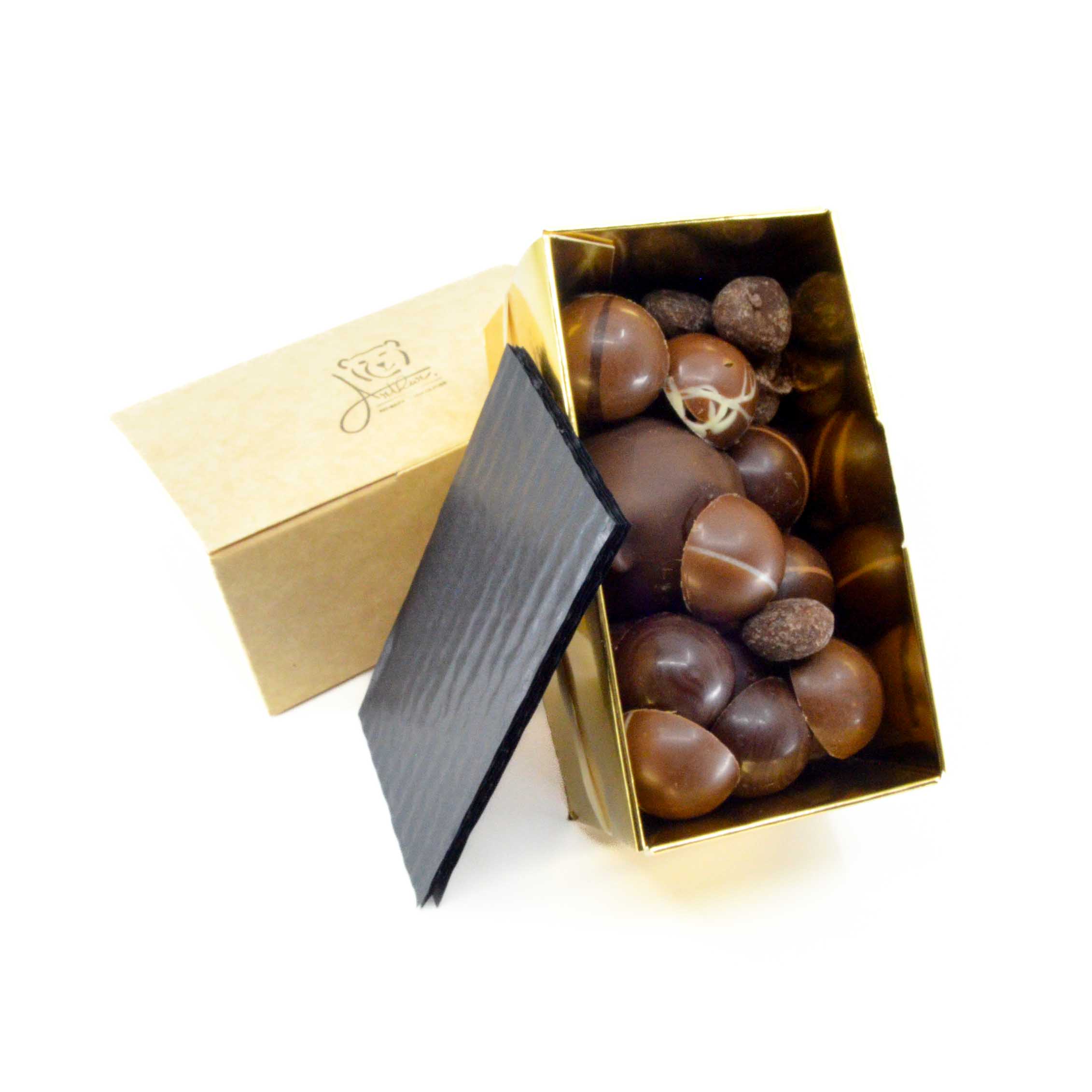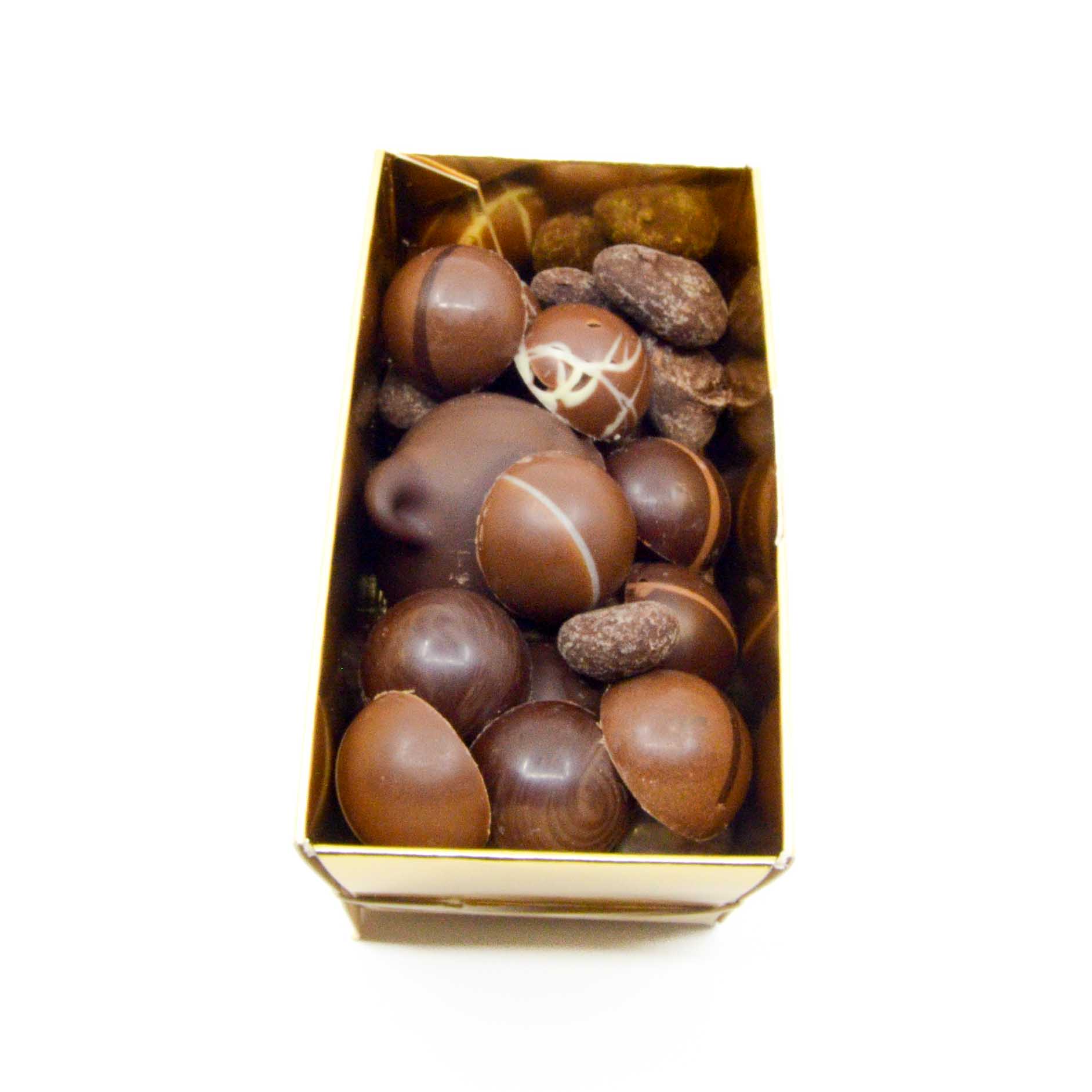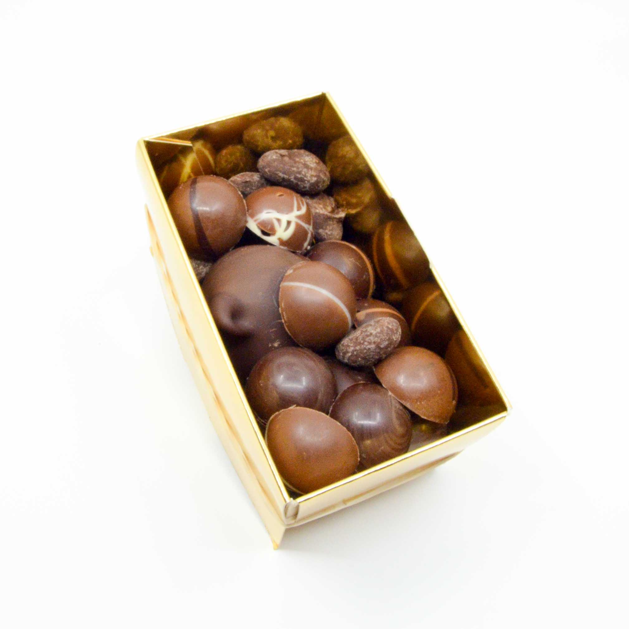 Découvrez l’assortiment de nos gourmandises chocolatées au sein d’un seul coffret : bonbons de chocolat, meringues chocolatées, amandes et noisettes caramélisées enrobées de chocolat noir ou lait. Poids 180g
