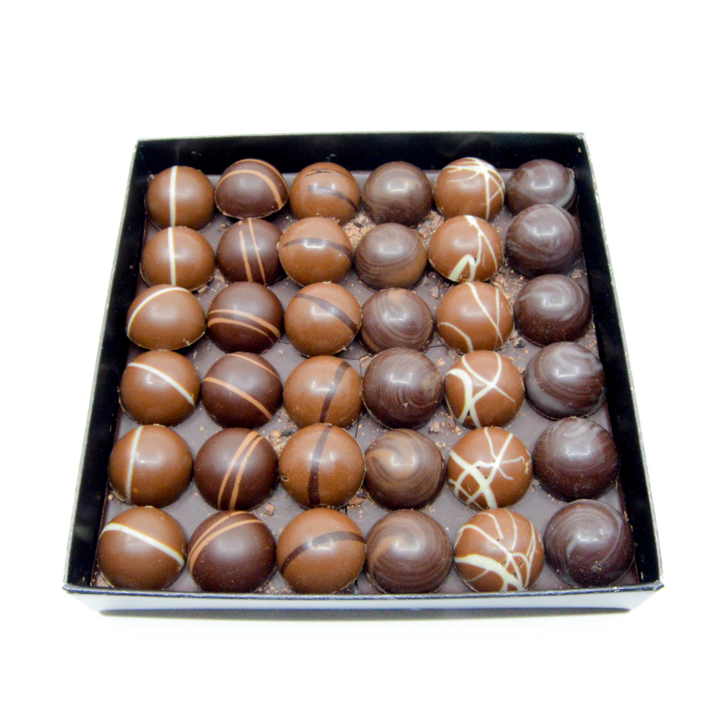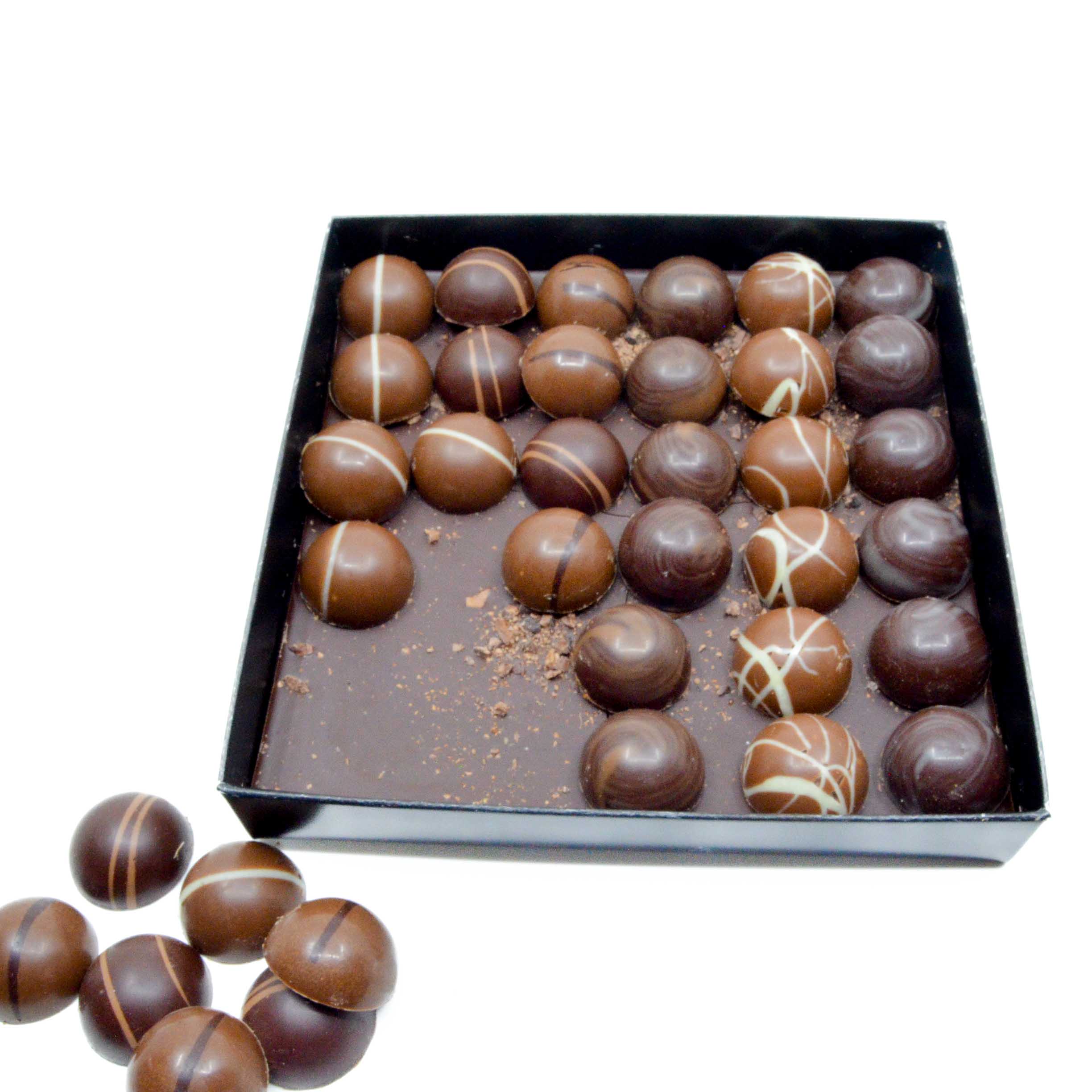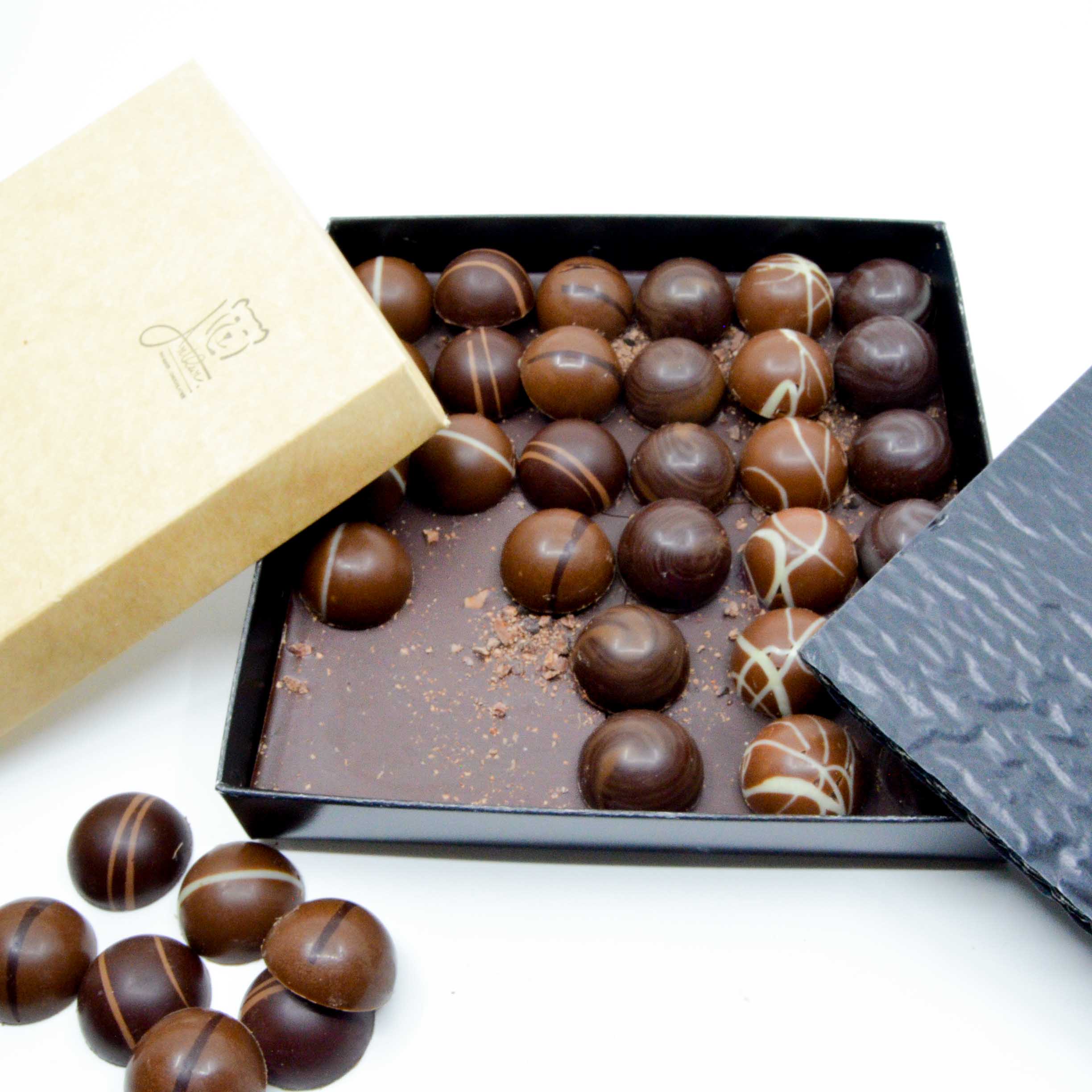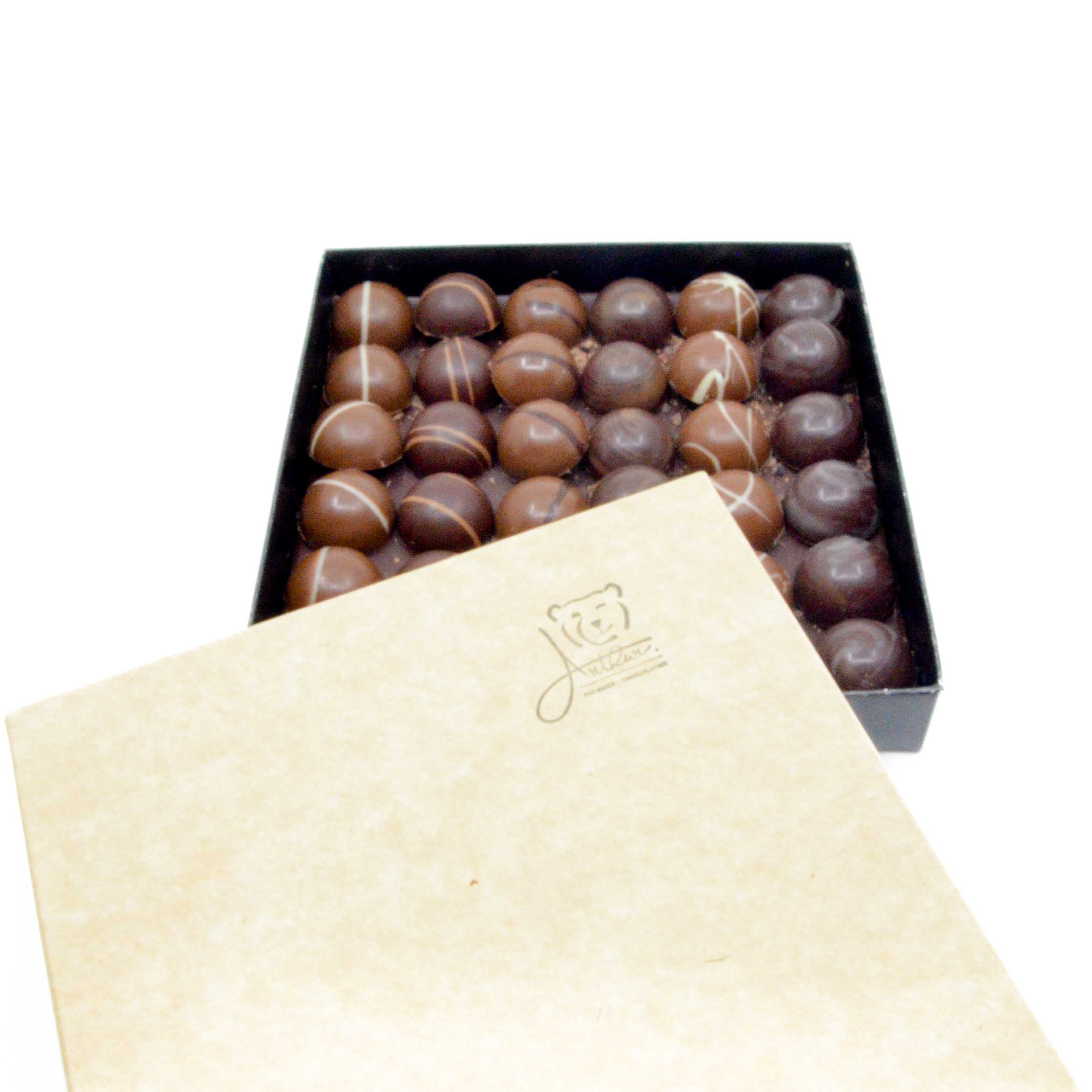 Venez découvrir notre gamme de chocolats artisanaux. Ce coffret se compose de 36 chocolats, vous y trouverez 6 variétés : Praliné et ganache, il y en a pour tous les goûts ! L’équilibre entre le sucre et les arômes proposés est notre priorité. Nous avons ajouté une plaquette de chocolat en fin de boite pour prolonger le plaisir.